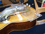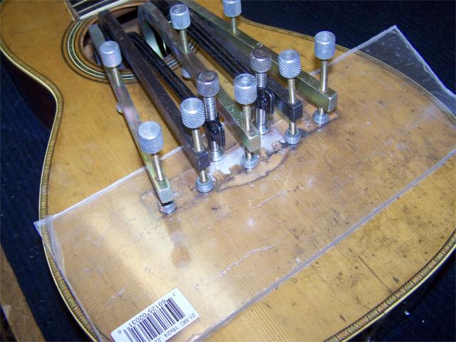 a desk lamp and a 100 watt light bulb, the top was heated gently and moistened slightly(on the inside). A seriesof shaped clamping cauls were made to place inside the guitar to allow the top to be clamped flat. The top was clamped to cool and dry, and leftclamped for about a week.