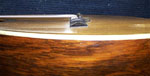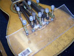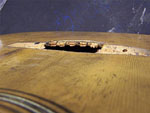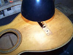 requires a little more surface area to stabilize the top. The bridge plate was made to original thickness and made in mahogany to match the original material. The surface of the plate was treated with potassium dichromate in order to oxidize the wood and make it appear as old as the interior of the guitar. The new bridge platewas then installed into the body. The plate finished the job of flattening the top very nicely and without adding significant mass to the soundboard.