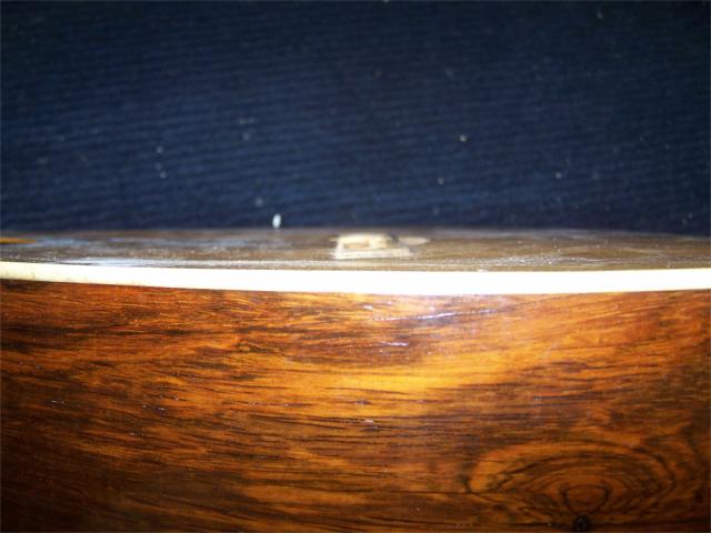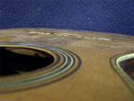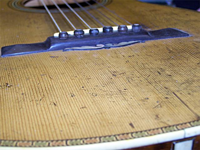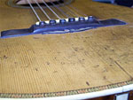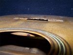 edge). The larger plate is installed to jump over the hole through the top and to stiffen the bridge area a little more than the originalwould have. Typically I would not install an oversized plate on a guitar like this but the loss of stiffness caused by the damage to the spruce