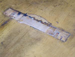was to remove the bridge. The bridge was heated in order to loosen the old hide glue that heldit to the top. As you can see from the pics, a fair chunk of spruce came up with the bridge.When the bridge buckled under tension and was left to twist or rotate the top the eventual result was cross grain breakage of the spruce top through the pin holes and also at the front edge ofthe bridge. You can see that a piece of the original mahogany bridge plate remained attached to the bridge as well, it having broken just like the spruce.