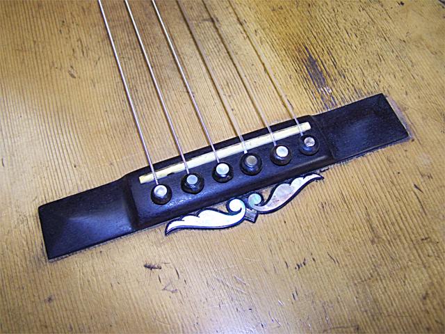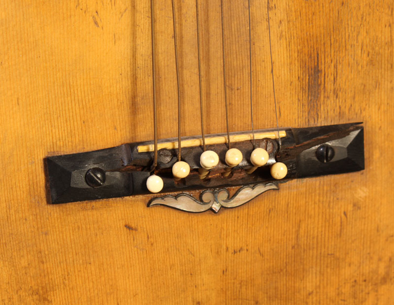 During the many years that I’ve been repairing and dealing in vintage guitars I’ve had the pleasure of the company of many 19th century Martin guitars and other quality made antique guitars. While these old guitars have landed here for a variety of repairs, one of the most common issues is bridge and top damage due to the use of steel strings. Similarly, bridge plate damage and bracing distortion can also accompany the use of steel strings on these lightly built guitars. During the 19th century metal strings were not yet in use on the guitar. Gut strings were standard and the guitars were built according to the expected tension load of the strings of the day. Given the low tension of gut strings the guitars of the 19th century were built much lighter than their steel string cousins.