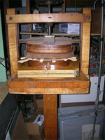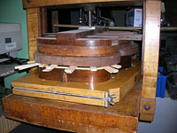 The top was then glued to the body using a body press. The press used in this operation is from the 1930s and came out of the Martin factory. To accomplish this task a platen matching the curvature of the top is placed on the table of the press. The top is placed on the platen. Then, the body (which is now held in a building form) has