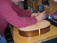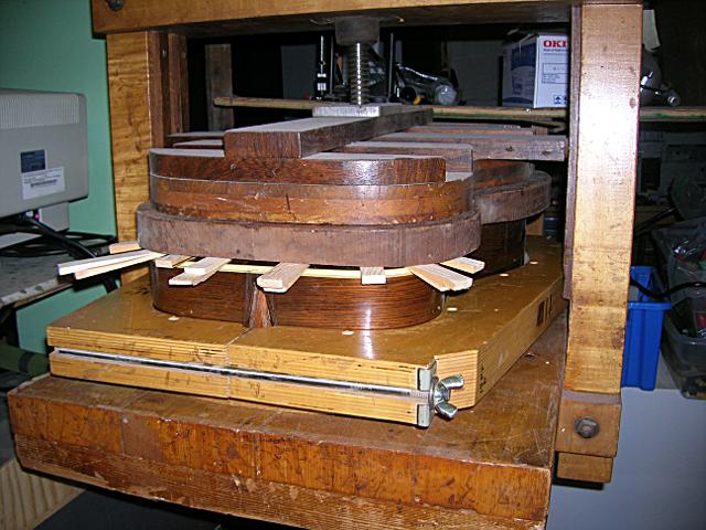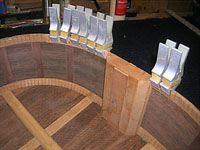 glue applied to the lining and is then placed on the top in properposition for clamping. A curved back board is used to clamp against the radius of the back and the entire sandwich of top platen, top, body, and back platen are clamped by applying pressure with the floating press platen that lowers from above. This arrangement allows for even pressure all the way around the body. If there are areas that seem to need a little more pressure this is accomplished by inserting wooden wedges along the back platen to distribute clamping pressure.