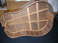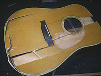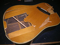 broken across the grain at the tail block. While longitudinal grain cracks are easy to repair cross grain damage is not so simple. In addition to the top damage there was catastrophic damage to the top bracing as well. Luckily, the back and sides suffered little damage. In most cases my approach would be to attempt to save the original top, but this top suffered far too much damage to be saved and in such a case complete replacement is the best option.