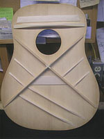 Next the top was braced using the appropriate 1960s pattern and gauge of bracing. The D-35 used ¼” gauge top bracing that was straight for most of it’s length (not scalloped) and tapered in the final few inches. The pic shows the top after the bracing was glued in place, shaped and sanded, the top ready to glue onto the body.