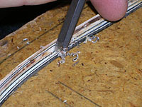 Before gluing the top to the body I took the time to prepare the oldbinding, which was removed in a single strip with purfling attached, to be reglued to the body. There was a good deal of spruce and cedar fibers stuck to the underside from the top and lining and all of that needed to be removed to provide a good flush surface for fitting andgluing to the body. Using a sharp chisel as a scraper, I cleaned the binding all the way around, removing all of the fibers from both surfaces that would contact the body.
